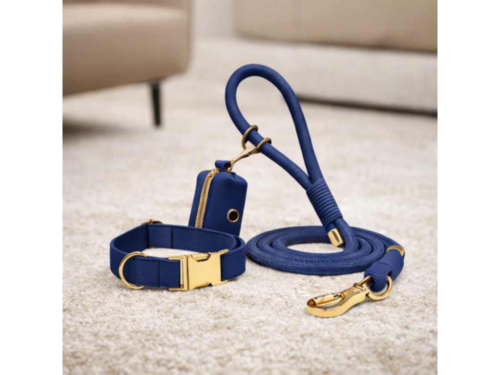 Kompletní set pro vašeho psa: stylový obojek s gravírovanou známkou, pevné vodítko a praktická taštička na sáčky. Dostupný v několika barvách a velikostech.