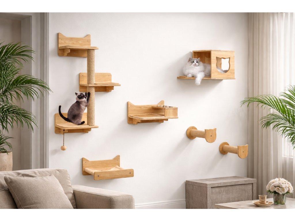➡️ Moderní nástěnná lezecká stěna pro kočky, která šetří místo a podporuje přirozený pohyb.